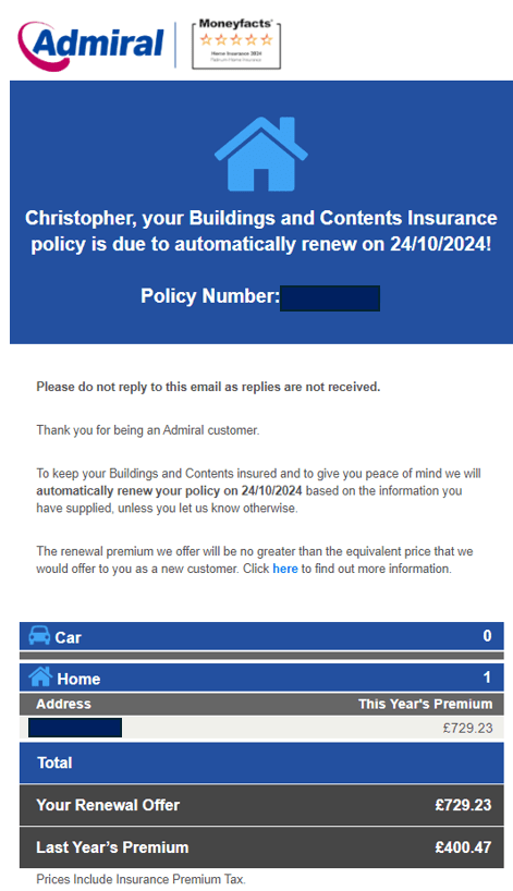 I recently received my home insurance renewal notice from Admiral. The banal and mundane adulting that everyone needs to do.
