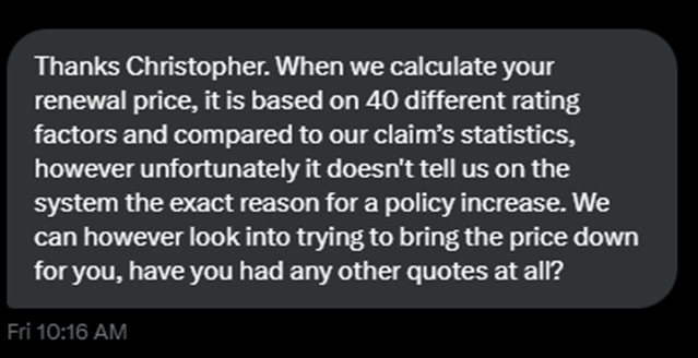 Instead, I got a customer service rep or bot, who (as you can see on the screenshot) told me that my premium was determined based on “40 different rating factors” and compared against their claim statistics. Obviously, they won’t tell me exactly why my premium had increased by such a ridiculous amount.