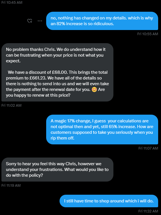 After a bit of Twitter ping-pong, they magicked me a £68 discount, bringing my renewal down to £661.23. This is a seemingly “generous” offer, but it is still a 65% increase from last year.